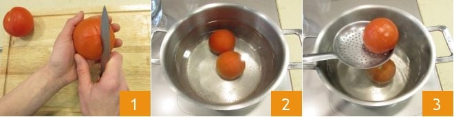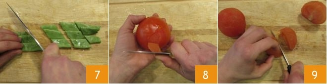 To prepare flat beans with tomato, cut a cross at the base of the tomatoes with a knife 1, then blanch them in hot water for about 1 minute 2. Drain them 3