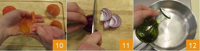 and remove the internal part with the seeds 10. Clean and slice the red onion 11, heat the oil in a pan 12,