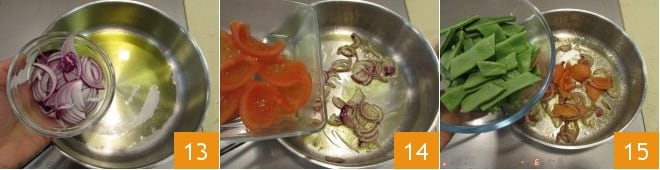 add the onion 13, let it stew over low heat for 5 minutes, then add the tomatoes 14, let them flavor for a couple of minutes, then add the flat beans 15.