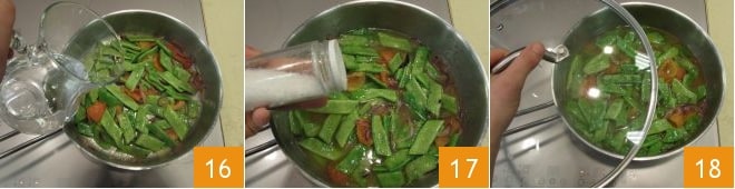 Add a little hot water, about 2 ladles 16, salt 17 and pepper, cover with the lid 18