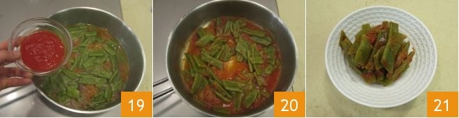 Cook the flat beans for about 10 minutes, then add the tomato purée 19 and continue cooking for about 5 minutes or as long as needed to thicken the sauce 20. Serve your flat beans with tomato hot, drizzled with extra virgin olive oil 21!