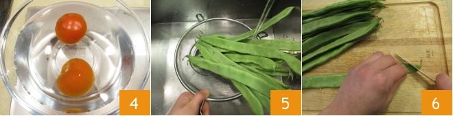 and cool them by immersing them in a bowl of cold water 4. Wash the flat beans under running water 5, then trim them 6