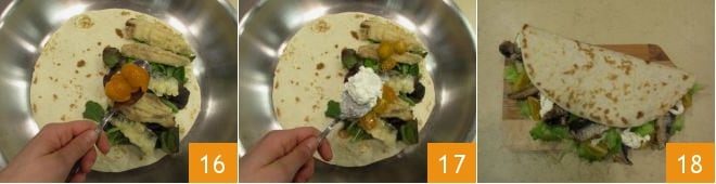 some yellow cherry tomatoes 16, and a couple of tablespoons of burrata 17. Fold the flatbread with fried sardines and burrata 18 and serve it hot.