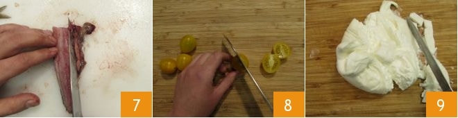 cut away the side parts 7 and rinse the fillets well under running water. Dry the fillets thoroughly; heat a pan with oil and ensure the temperature does not exceed 356°F. While the oil is heating up, prepare the other ingredients so that you can quickly assemble the flatbreads: wash and dry the salad greens thoroughly. Cut the yellow cherry tomatoes in half 8, then chop the burrata 9.