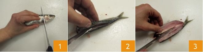 To prepare the flatbread with fried sardines and burrata, start by cleaning the sardines: remove the head 1, cut along the back 2, open them like a book 3,