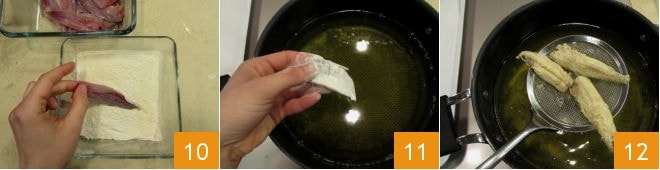 Mix all-purpose flour, semolina flour, and rice flour in a bowl. Dredge the sardines 10 and fry a few at a time in the hot oil 11: it will take just a few minutes for them to become golden brown. Drain the sardines as you go 12,