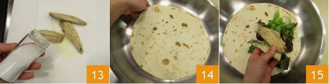 placing them on a tray lined with kitchen paper to absorb the excess oil and season with salt 13. In a large pan, heat the flatbread on both sides for about 2 minutes 14. Top half of the flatbread with salad greens, 5-6 fried sardines 15,