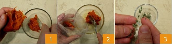 To prepare the flatbreads with 'nduja and baked black olives, get the 'nduja salami: place it in a small bowl 1 and then transfer it to a piping bag with the help of a teaspoon 2. Take a few sprigs of thyme that will be used and pluck the leaves 3 that will be used to garnish the flatbreads. Finally, get the oven-dried black olives, which can also be seasoned in a small bowl with crushed pink pepper, oregano, and a drizzle of extra virgin olive oil to further enhance their flavor.