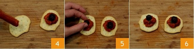 Now you can assemble your flatbreads with 'nduja and baked black olives: on a cutting board, place the flatbreads, add a dollop of 'nduja with the piping bag 4, and then place a baked black olive on each flatbread 6. Garnish with a thyme leaf and your flatbreads with 'nduja and baked black olives will be ready to be served as spicy finger food!