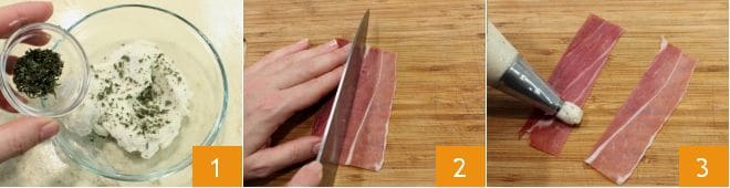 To prepare the flatbreads with San Daniele rolls, start with the robiola cream to stuff the slices of ham: in a bowl, place the robiola cheese, mix it, and adjust salt and pepper to taste. Then add the mix of herbs with mint, basil, and some chive sprigs to taste, previously chopped 1. Mix to blend the herbs and soften the robiola cheese and transfer the obtained cream into a piping bag. Then on a cutting board, position the slices of ham, divide them in half lengthwise 2. With the piping bag, place a dollop of robiola cream on each slice of ham 3.