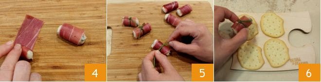 Then roll it up on itself 4 and close each roll obtained with a chive sprig 5. Now you can compose the flatbreads with San Daniele rolls 6 and serve them as finger food for your appetizer!