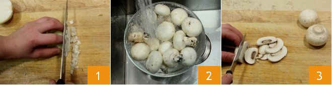 To prepare the flattened rice cake, you can start by peeling and chopping the onion 1. Then focus on the champignon mushrooms, wash them under a strong stream of running water 2, then clean them one by one with a cloth or paper towel to remove the soil. Then remove the stem part with the roots and soil and cut the mushroom caps into rather thin slices 3.