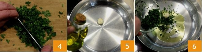 Then also chop the bunch of fresh parsley 4. In a large pan, place the peeled garlic clove and pour in a drizzle of oil 5, then add the chopped parsley 6. Sauté for about 2 minutes.
