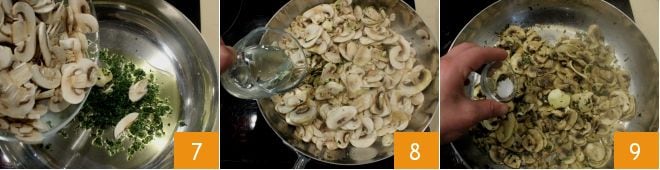 Then add the champignon mushrooms 7 and sauté over low heat for about 5 minutes, then add 2 tablespoons of white wine 8. Stir and let the mushrooms cook for about 5 minutes. Adjust with salt 9 and pepper to taste, then let cook for about 15 minutes over medium heat. The mushrooms should not cook completely because they will finish cooking in the oven.