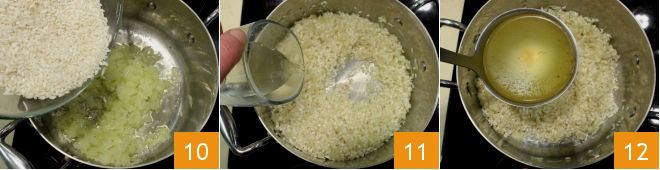 While the mushrooms are cooking, in a large pot, pour a drizzle of oil, add the previously chopped onion and sauté for about 5 minutes. Then sprinkle the rice 10, sauté for a couple of minutes, stirring with a wooden spoon, then pour the remaining 2 tablespoons of white wine 11. Continue cooking the risotto for about 20 minutes, gradually adding the Vegetable broth with a ladle 12.