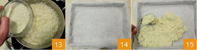 When there are 2 minutes left until the rice is done, add 1/2 cup of Grana 13, briefly cream, turn off the heat, and let the risotto rest for a few minutes. Take a rectangular pan of 12x9 inches, line it with parchment paper soaked in water and squeezed 14 so that it adheres well to the pan. Then with a spoon, start creating a layer of rice 15, compacting it with the back of the spoon.