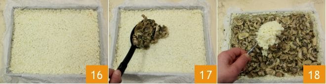 Once you have covered the whole bottom 16, create a layer of mushrooms 17, then another layer of rice 18, so that the result is two layers with the mushroom filling.