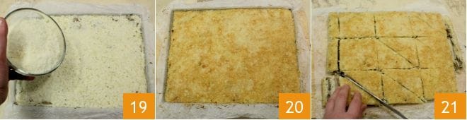 Finally, sprinkle the surface with the remaining Grana 19. Finally, bake in a preheated static oven at 392°F for about 30 minutes (if using a fan oven at 356°F for about 25 minutes). Then remove from the oven 20, let cool slightly, and cut your flattened rice cake into squares or rectangles before serving it hot or warm 21!