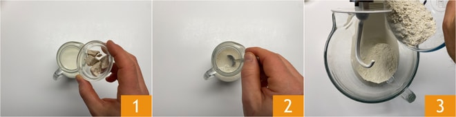 To prepare the Florentine schiacciata, start by pouring the yeast into the milk 1 and dissolve it using a teaspoon 2. In the bowl of the stand mixer, or by hand if you don't have one, pour the flour 3.