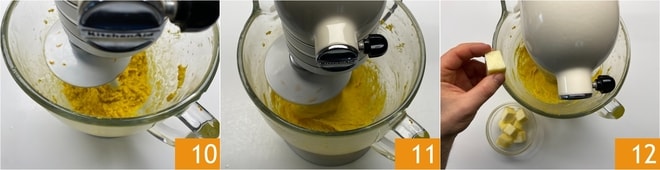 At this point, let the hook work for about ten minutes 10: initially, the dough will tend to separate, but gradually it will become uniform 11. If necessary, turn off the machine and push the dough towards the center. Once it's smooth, continue by adding the soft butter one piece at a time: this operation will take about 5-10 minutes 12.