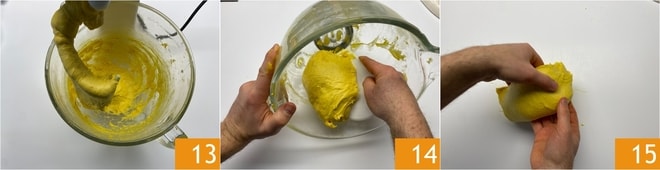 The dough will be ready when it is well incorporated onto the hook 13. Transfer it to the work surface 14. It will be soft and slightly sticky, but don't worry and don't add flour, because now it's time to give the reinforcement folds. You need to lift it quickly 15,