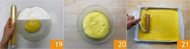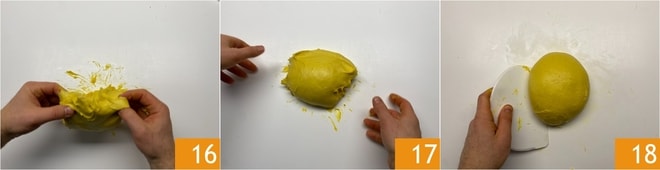 and slap it on the surface, bringing the dough from the point closest to you 16 and folding it over itself to form a ball 17. Repeat this operation 3 times in total. At this point, it will become smooth, so round the dough with the help of a dough scraper 18.