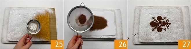 When it's cool, flip it onto a cutting board and sprinkle with plenty of powdered sugar 25, place the lily-shaped stencil and dust with cocoa 26. Carefully remove the stencil and enjoy your homemade Florentine schiacciata 27!
