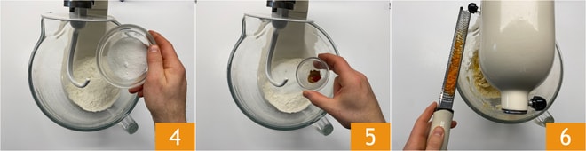 Add the sugar 4, spices 5, and grated orange zest 6.