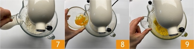 Start the hook at medium-low speed and pour in the milk gradually 7. Once incorporated, add the egg 8 and then the salt 9.