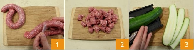 To prepare the skillet focaccia, start with the filling: cut the sausage open and remove the casing 1, then chop it with a knife 2, while using a mandolin to slice the zucchini thinly lengthwise 3;