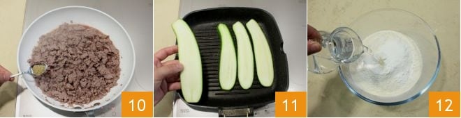Towards the end of cooking, season with crushed fennel seeds 10; while the sausage is cooking, grill the zucchini on a cast-iron grill or non-stick skillet 11. Once the filling is ready, you can focus on the dough: sift the flour into a bowl and add the warm water 12.