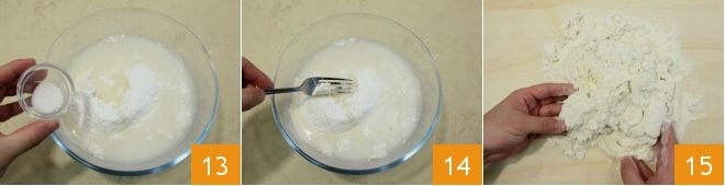 Add the instant yeast 13 and mix with a fork to combine the ingredients 14; finally add the salt. When the dough becomes more compact, transfer it to a lightly floured work surface and knead by hand 15.