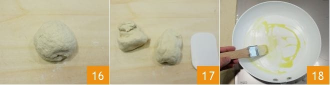 when you have obtained a soft and homogeneous dough 16 (if it is too sticky, you can add a little flour), divide it in half 17. Meanwhile, oil a skillet about 12 inches in diameter 18