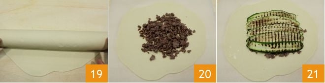 heat it slightly and in the meantime roll out the two halves of dough into two thin discs about 1/8 inch thick with the same diameter as the skillet 19. Fill one with the sausage and zucchini filling (20-21),