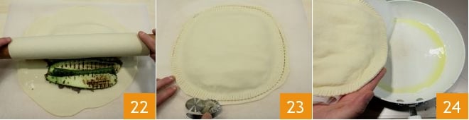 then roll the other dough disc and unroll it over the filled one 22, seal the edges with the tines of a fork and trim the excess dough with a fluted pastry cutter 23. Then transfer the focaccia to the slightly heated skillet to cook it 24; it will take 7-8 minutes total, for both sides.