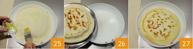Brush the surface with oil as well 25, you can cook it covered with a lid, then when the bottom is golden brown, you can cook it for a few minutes on the other side too. To flip it, you can use the skillet lid, just like flipping an omelet 26. Cook the focaccia on the other side as well and then serve it hot 27!