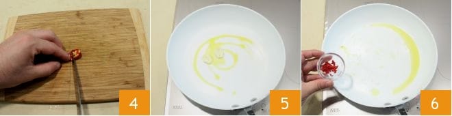 Prepare the chili pepper as well: remove the seeds 4 and chop it; then pour a drizzle of oil in a large skillet, fry a peeled garlic clove 5, and remove it when golden brown. Add the chopped chili pepper 6