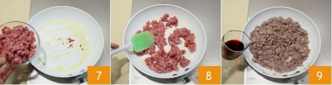and the sausage 7; stir 8 and let it fry briefly. Then deglaze with red wine 9 and let it evaporate. Then add salt and cook the sausage for about 15-20 minutes (it should not dry out too much).