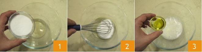 To make fortune cookies, first prepare the batter: pour the egg whites and sugar into a bowl 1 and beat with a whisk to combine them, but do not whip them to stiff peaks 2. Add the oil 3