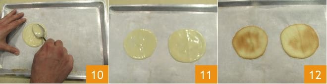 Preheat the oven to 340°F in static mode. Meanwhile, line a baking sheet with parchment paper (if you have one, you can use a silicone mat), pour a tablespoon of batter on it and spread it evenly with the back of the spoon without leaving holes 10, until you get a circle with a diameter of 4 inches 11. You can spread another one a few inches away from the other. Do not bake more than two discs at a time to ease the subsequent steps. Once the oven has reached the temperature, bake the cookies for about 10 minutes: the baking time may vary slightly from cookie to cookie, so before taking them out, make sure the edge is golden and the surface is slightly colored 12.