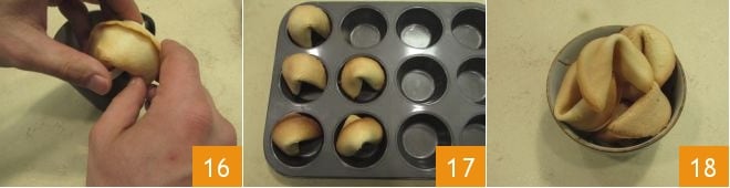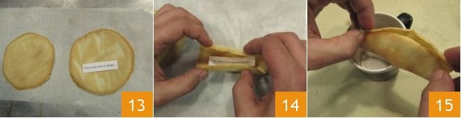 Once removed from the oven, turn them over to the other side and place the note in the center, while the cookie is still hot 13. Gently bring the edges together to fold the cookie in half with the note inside, but without completely matching the ends 14. Use the rim of a cup to press on the bottom part of the cookie 15