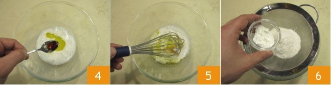 and work with the whisk to blend the powders into the mixture 7. Finally, add a pinch of water 8 and mix further 9. The batter should be quite thick.