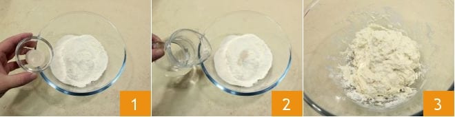 To make the fougasse, start by preparing the starter, or pre-dough: in a large bowl, pour the sifted flour, yeast 1, and then the water 2; knead quickly by hand until you get a compact but not completely smooth dough 3.
