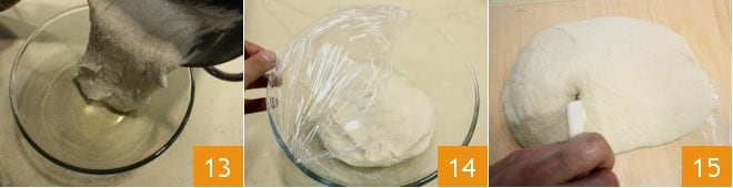 And pour the dough 13; form a ball and let it rise for at least 1 hour in the oven turned off but with the light on, covering with plastic wrap 14. After the necessary time, transfer it onto a lightly floured (or oiled) work surface and then with a dough scraper divide it into two equal parts 15.
