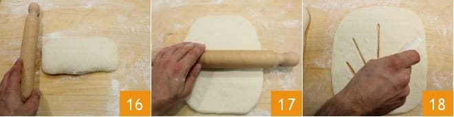 With each piece, create a rectangular shape 16 and then on the work surface (or directly on a sheet of baking paper) roll out the dough one piece at a time with a rolling pin, forming two rectangles measuring 7x9 inches 17. With a dough scraper, make 5 cuts in the dough measuring 4 inches (which during baking will take the shape of a spike), leaving at least 3/4 inch from the edges: starting from the bottom, make two oblique cuts 5/8 inch apart, then continue with a central cut, and finally two more oblique side cuts on the opposite side 18.