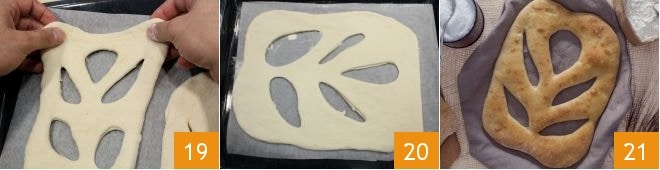 Transfer the fougasse onto a baking tray lined with baking paper and with your fingers widen the cuts you have made, gently pulling the corners of the dough 19. Once finished 20, cover with plastic wrap avoiding contact (alternatively, you can also brush it with oil), allowing it to rise again for 45 minutes, always in the oven turned off but with the light on. Then, bake in a preheated static oven at 375°F for 20-25 minutes (or 340°F for 15-18 minutes if using a convection oven): when the surface is well golden, remove from the oven and let cool on a wire rack; finally, you can serve and enjoy your fougasse, accompanying it with cheese or cold cuts 21.