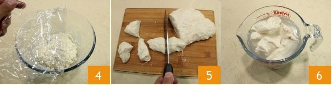 Let the starter rest in the refrigerator for at least 12 hours covered with plastic wrap 4. After 12 hours, transfer it to an oiled work surface, then cut it into pieces 5 placing them in a bowl with warm water to soften them 6.