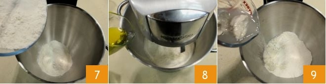 Then proceed with preparing the dough: in a stand mixer equipped with a hook, pour the flour 7, oil 8, and warm water along with all the chopped starter 9.