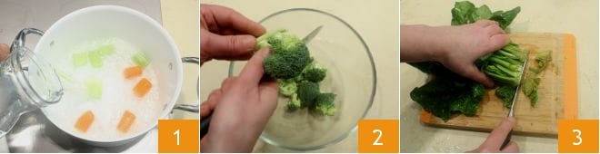 To prepare the Frankenstein soup, place the cleaned celery and carrot, cut into fairly large pieces, in a pot and add water and a pinch of salt 1; bring to a boil and in the meantime clean the broccoli, remove the florets from the central stem, and place them in a bowl 2. Wash the spinach, remove the toughest part of the stem 3, and set them aside.