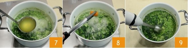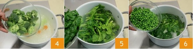When the water reaches a boil, add the broccoli 5, cook for about 5 minutes, then add the spinach 6 and finally the peas 6.